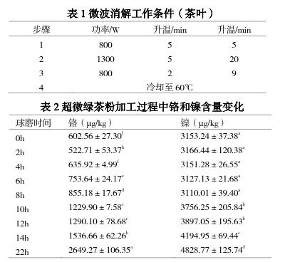 血[6];過量的鎳可引起炎癥、癌癥、癥、系統(tǒng)紊亂、降低生育能力、致畸和致突變等[7];鉻雖是人體必需的微量元素,但高鉻的食用也會(huì)引起不適[8]。超微綠茶粉是將達(dá)到綠色標(biāo)準(zhǔn)的綠茶茶葉,經(jīng)超微粉碎形成 200 目(74μm)甚至達(dá)到 1000 目(12μm)以上的綠茶超微細(xì)粉[9-10]。現(xiàn)階段我國企業(yè)大多采用球磨方式加工超微綠茶粉,在球磨加工過程中,茶葉被粉碎的同時(shí),研磨材料本身也會(huì)發(fā)生變化,從而可能給超微綠茶粉帶來重金屬污染。另外,與傳統(tǒng)茶葉不同的是,超微綠茶粉屬于茶葉深加工范疇,常被以全組分形式加入到食品和化妝品中[11],又因其中的重金屬元素應(yīng)滿足《食品標(biāo)準(zhǔn)食品中污染物限量》和《茶葉中鉻、鎘、汞、砷及氟化物限量》對(duì)茶葉中重金屬限量要求[12-13],因此應(yīng)對(duì)超微綠茶粉加工過程中重金屬污染給予關(guān)注,但目前對(duì)超微綠茶粉加工過程中的重金屬含量變化未見報(bào)道。本文對(duì)球磨加工過程中超微綠茶粉的重金屬含量進(jìn)行檢測(cè)分析,同時(shí),采用三組球磨材料不銹鋼球-不銹鋼罐、氧化鋯球-不銹鋼罐、瑪瑙球-尼龍罐對(duì)超微綠茶粉進(jìn)行加工,通過重金屬元素鉻和鎳的檢測(cè),并結(jié)合粒徑分析,為尋找合適的球磨材料提供依據(jù)。