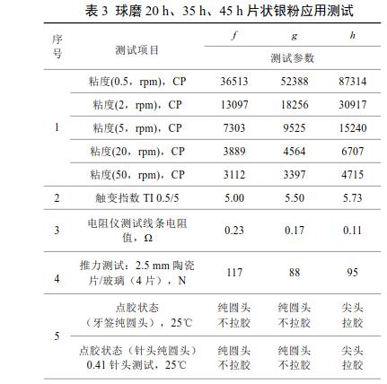 由表3可知,球磨20h、35h片狀銀粉制得IC封裝導(dǎo)電銀膠點(diǎn)膠效果好,無(wú)明顯拉膠現(xiàn)象;45h的制得導(dǎo)電銀漿點(diǎn)膠存在尖頭和拉膠現(xiàn)象。同時(shí)可以看出,20h的片狀銀粉觸變指數(shù)低,導(dǎo)電銀膠需要有良好觸變特性便于點(diǎn)膠;45h的片狀銀粉觸變指數(shù)高;而且可以看出35h、45h制得的導(dǎo)電膠的線條電阻值較小。這三款產(chǎn)品推力測(cè)試、固化后硬度測(cè)試、高低溫冷熱沖擊測(cè)試及高溫高濕測(cè)試均滿足應(yīng)用。綜合上述各項(xiàng)指標(biāo),球磨35h制得的片狀銀粉制得的導(dǎo)電銀膠均達(dá)到了應(yīng)用指標(biāo)要求。